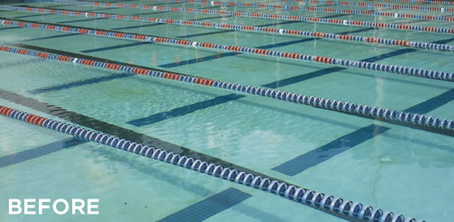Years ago this pool was plastered improperly, and the school has been having problems ever since. The finish was chipping away in large chunks, and there was discoloration in the plaster, which was likely caused by improper water chemistry. We decided to chisel out the imperfections, add 2 coats of Permakote, and tile over the existing tile. Upon further consultation with me, I directed them to a pebble pool finish, Sunstone Pearl Cove Blue, by CL Industries. The durability and longevity of this pebble finish is quickly making it more popular than quartz or traditional plaster. The crew and I developed this Cove Blue finish with CL Industries, and it has become a best seller. In fact, Tempool is using Cove Blue in 75% of their commercial pool remodels.